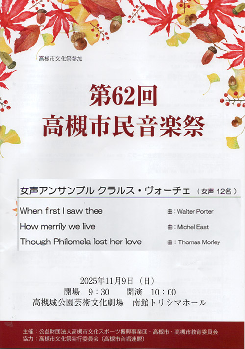 第62回 高槻市民音楽祭 おすすめ 投稿者: cv、カテゴリー: cv, 活動 高槻市民音楽祭でイギリスマドリガル3曲を演奏しました。 歌って楽しい!、聴いて楽しいマドリガル! 来年のコンサートに向け、更にブラッシュアップさせたいです。 共有: Facebook で共有するにはクリックしてください (新しいウィンドウで開きます) Facebook いいね:いいね 読み込み中…
